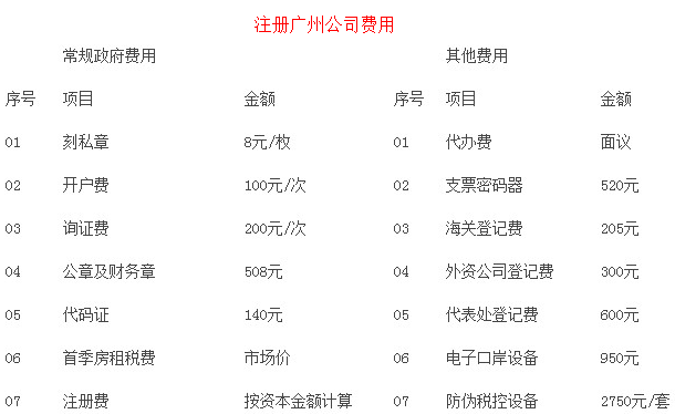 注册广州公司必要费用: